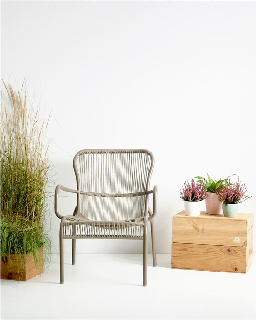 De Loop loungestoel is een lichte en stapelbare tuinstoel die verkrijgbaar is in Black, Taupe, Dune white, Moss, en Terracotta